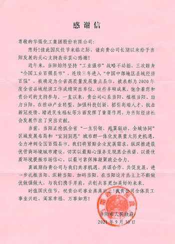 感谢信中说,近年来,当阳始终坚持“工业强市”战略不动摇,三次跻身“全国工业百强县市”,连续三年进入“中国中部地区县域经济百强”,被确定为全省高质量发展重点县市,被表彰为2020年度全省县域经济工作成绩突出单位。这些丰硕成果,饱含着乐天使集团的支持参与。