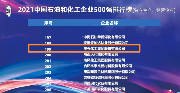 11月29日,2021中国石油和化工企业500强发布会暨双循环新格局下石油化工大企业的机遇与挑战高峰论坛和大连市石化产业推介会在线上举行。会议发布了2021中国石油和化工企业500强排行榜(综合类)、2021中国石油和化工企业500强排行榜(独立生产、经营企业),以及分行业排行榜。我公司以亮眼的成绩荣登2021中国石油和化工企业500强排行榜单(独立生产、经营企业),位列第199位。这是我公司连续 5年入围中国石油和化工企业500强榜单,此外我公司连续多年跻身中国化肥企业100强、中国磷复肥企业100强。