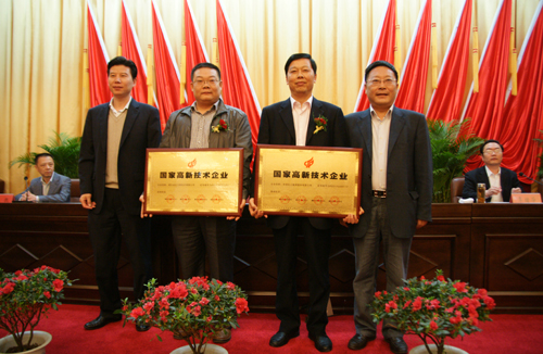 4月11日下午,市委、市政府在市委会议室隆重召开全市科学技术奖励大会,市委书记郑廷贵、市委副书记、市长石显银为我公司颁发了国家高新技术企业牌,我公司副总经理杨世立代表公司领取铜牌。会议还表彰了2011年度为当阳科学技术进步作出突出贡献的单位和个人。市委副书记、市长石显银作了重要讲话。